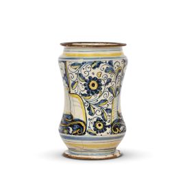 in maiolica dipinta in policromia, corpo cilindrico rastremato al centro con piede carenato su base piana, la bocca con orlo estroflesso sorretta da un collo breve, spalla e la base appena arrotondate. L’ornato occupa l’intera superficie del vaso con un mascherone e un motivo triangolare con le lettere ACM incluse in piccoli cerchi, a centrare il cartiglio farmaceutico accompagnati da un motivo fitoforme a risparmio su fondo campito di blu. Un albarello della medesima farmacia, la cui identificazione potrebbe essere suggerita dalle lettere sul fronte, è conservato nella collezione Bayer di Milano, ascritto da Grazia Biscontini ad ambito romagnolo, vicino alle produzioni faentine nella prima metà del XVII secolo, anche se una nuova lettura critica propone invece un’assegnazione a fornaci toscane; alt. cm 19, diam. bocca cm 11, diam. piede cm 9,6