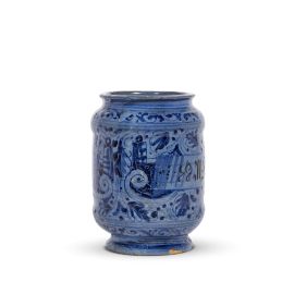 in maiolica dipinta in policromia, corpo cilindrico appena mosso al centro, spalla arrotondata, piede su base piana con orlo espanso, bocca tagliata a stecca. L’ornato ricopre uniformemente l’intera superficie con un motivo a “foglie bipartite” con racemi vegetali in blu di cobalto su fondo berettino. Il cartiglio al centro reca una scritta a caratteri gotici redatta anch’essa in blu; alt. cm 15,2, diam. bocca cm 9,2, diam. piede cm 8,2