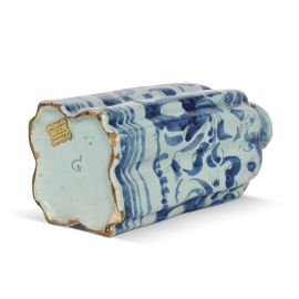 in maiolica dipinta in monocromia blu, corpo di forma quadrata con collo breve e stretto che si apre in una imboccatura con orlo estroflesso. La decorazione monocroma, realizzata su fondo azzurrato, propone il caratteristico ornato orientalizzante a tappezzeria con motivi fitomorfi, decoro che trova riscontro nella produzione ligure della seconda metà del Seicento. Sotto la base lettera G in blu; alt. cm 25,5, base cm 11,5x11,5