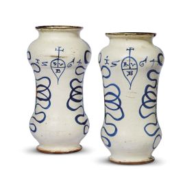 in maiolica decorata a policromia, corpo cilindrico fortemente rastremato al centro secondo la tipica forma a rocchetto, imboccatura con orlo estroflesso dal profilo arrotondato, collo breve che si apre su una spalla rigonfia e arrotondata e piede basso dall’orlo tagliato a stecca e poggiante su una base piana. Il decoro interessa principalmente la parte frontale con una ghirlanda a festone fogliato e fruttini, centrato da due elementi tondeggianti, che circonda un cartiglio rettangolare con scritta farmaceutica in lettere gotiche. Al di sotto del cartiglio un emblema nobiliare (d’azzurro allo scaglione doro accompagnato da tre pigne). Sul retro compare l’emblema della farmacia in uno scudo ovale sormontato e tagliato da una croce e riempito dalle lettere R V B accompagnato dalla data 1564, tra nastri azzurri svolazzanti; alt. cm 25 e 24, diam. bocca cm 9,6, diam. piede cm 9,2