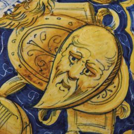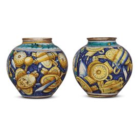 in maiolica dipinta in policromia, corpo globulare con orlo “gittato” poggiante su base piana. L’intera superficie è dipinta su un rivestimento a smalto spesso e brillante, con un ornato insolito, dove il corpo interamente ricoperto da panoplie e trofei su fondo blu circonda da un lato due medaglioni con cornice a cartoccio, in cui sono raffigurati un ritratto maschile su fondo verde e uno femminile su fondo manganese, e dall’altro un’altra coppia di medaglioni che racchiudono un putto che sorregge un fascio e un erotino con arco; a completare l’ornato una ghirlanda robbiana a foglie lanceolate e piccoli frutti dipinta sulla spalla. I due vasi, transitati sul mercato in una celebre asta tenutasi a Milano nel 1986, non hanno confronti puntuali precisi, ma ritrovano qualche affinità in un vaso globulare del MIC di Faenza nella donazione Mereghi, con un curioso gioco di foglie su fondo giallo e alcune panoplie, oppure in un vaso della collezione Cini di Venezia, che riporta una decorazione a trofei con strumenti musicali. Decori affini si trovano anche in due albarelli già appartenuti alla collezione Cora, dove ritorna il ritratto muliebre in campo giallo. Tuttavia il gusto dei trofei, di chiara derivazione marchigiana, trova maggior vicinanza nei lavori della bottega di Mastro Ludovico, lasciando aperta la strada a nuovi approfondimenti. Sul fondo etichetta MOSTRA MAIOLICA ITALIANA / LA MIA CASA 1977; alt. cm 21,4, diam. bocca cm 10,7, diam. piede cm 10,4