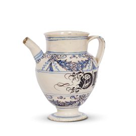 in maiolica dipinta in policromia, corpo ovoidale con alto collo cilindrico appena rastremato che si apre in una larga imboccatura dall’orlo estroflesso con labbro sottile e arrotondato, piede basso con collo largo, base concava e orlo arrotondato con modanatura a scozia, larga ansa nastriforme contrapposta al beccuccio dritto dal profilo troncoconico.