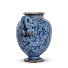in maiolica dipinta in monocromia, corpo di forma ovoidale su piede piano e espanso, collo cilindrico con un orlo appena aggettante, ansa a doppia corda desinente a ricciolo, cannello breve e cilindrico. L’orciolo è decorato su fondo smaltato berettino con motivo fitomorfo con foglie bipartite e fruttini che circondano un cartiglio sinuoso iscritto in caratteri gotici. Il confronto morfologicamente più vicino è costituito da un orciolo della collezione Bayer di Milano, con caratteristiche stilistiche appena differenti, ma che condivide con il nostro vaso l’humus culturale delle fornaci romane tra la fine del secolo XVI e l’inizio del secolo XVII; alt. cm 23,2, diam. bocca cm 10, diam. piede cm 8,6