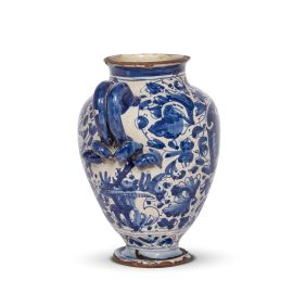 in maiolica monocroma, corpo di forma ovoidale su piede piano espanso, collo cilindrico con orlo appena aggettante, ansa a doppia corda desinente a ricciolo, cannello breve e cilindrico. Il decoro, realizzato su fondo smaltato bianco crema, prevede una sequenza di tralci sinuosi e foglie bipartite che si sviluppano su collo e piede, a incorniciare sul fronte il cartiglio dalla terminazione mossa e ombreggiata con iscrizione farmaceutica in caratteri gotici delineati in blu, sotteso da mascherone femminile; sul retro, sotto l’ansa, è dipinto un vaso baccellato. Il vaso trova riscontro morfologico e stilistico in un’opera analoga conservata nella collezione Bayer di Milano; alt. cm 21,5, diam. bocca cm 8,5, diam. piede cm 7,8