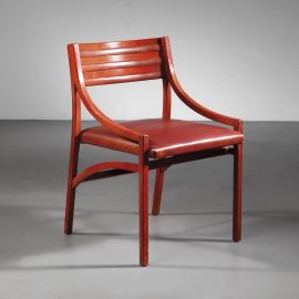 EIGHT «110» CHAIRS, WOODEN STRUCTURE, RED FABRIC UPHOLSTERED SEAT