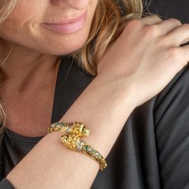 in oro giallo e bianco 18kt, raffigurante all'estremità due teste leonine, impreziosito da smeraldi taglio rotondo per ct 0.60 circa e da diamanti taglio huit huit per ct 0.20 circa, punzone 750, dim. cm 6,5x6. diam. interno cm 6, gr. 38