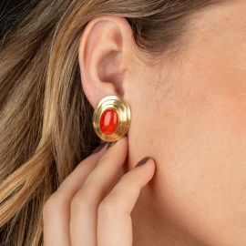 in oro giallo 18kt, di forma ovale e con profili scanalati, al centro due coralli taglio cabochon, chiusura a clip, dim. cm 2x2,5, gr. 18 complessivi
