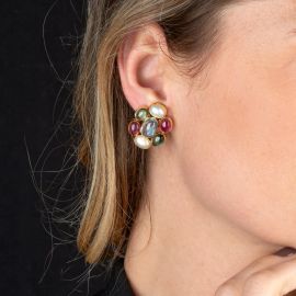 in oro giallo 18kt, impreziositi da pietre semipreziose taglio cabochon e perle mabé, chiusura a clip, punzoni 750 e del fabbricante "40 VR", dim. cm 2x3, gr. 17 complessivi