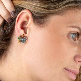 composto da un paio di orecchini floreali in oro giallo 18kt, decorati in smalti policromi, con pietre di colore e diamanti, punzoni 750 e del fabbricante, chiusura a clip, dim. cm 2x2x1 circa, gr. 9; accompagnati da un pendente in oro 14kt, decorato in smalto e impreziosito da una pietra di colore e diamanti, punzone 14kt, dim. cm 1,5x3,5, gr. 8