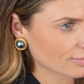 in oro giallo 18kt, con al centro semisfere in madreperla, punzone 750, chiusura a clip, dim. cm 2,5x2,5, gr. 19 complessivi