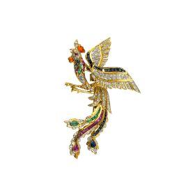 in oro giallo 18kt, di cui una a forma di fenice, con ala centrale molleggiante, impreziosita da pietre di colore taglio fantasia e diamanti taglio huit huit, dim. cm 5x3; accompagnata da una seconda spilla a forma di pantera, decorata in smalto, punzone 750, dim. cm 6,5x2 circa, gr. 23 complessivi