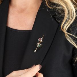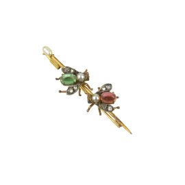 di cui una a forma di fiore in oro giallo 18kt, decorata in smalto e impreziosita al centro da un diamante taglio brillante, punzone 750, dim. cm 2x4, gr. 10; accompagnata da una seconda spilla a barretta in oro e argento, sormontata da due mosche impreziosite da pietre semipreziose, perle e diamanti, lungh. cm 4,5, gr. 6