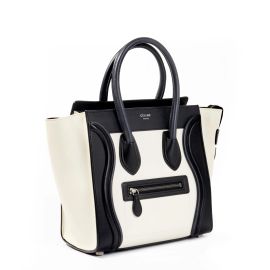 In pelle di agnello bicolore, un attualissimo bianco e nero molto accattivante. Chiusura in testa con zip e interno in pelle nera con una taschina con zip e tasca per cellulare; doppio manico in pelle ed ulteriore micro tasca frontale con zip e logo stampato in color argento al bordo alto.