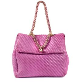 In pelle rosa su tessuto maglia visibile all'interno in marrone scuro. Chiusura con doppia calamita e ardiglione. Metalleria in color oro rosa; tracolla doppia a intreccio, una parte corta e una lunga per il doppio indosso.