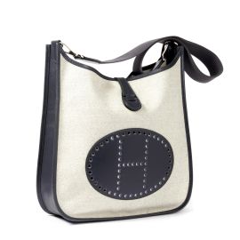 La borsa presa in prestito dagli oggetti da cavallerizzo, con la tracolla in nastro agganciata con moschettoni in ottone color argento lucido, corpo borsa in tessuto cotone/lino ecrù e fianco in pelle grigio asfalto come la tracolla e la parte frontale contenente il logo traforato che ricorda l'impronta dello zoccolo del cavallo.