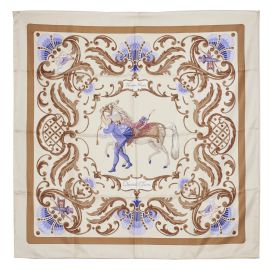 In seta 100% di un raffinato color burro con stampa marrone chiaro e immagine centrale in blu violetto.