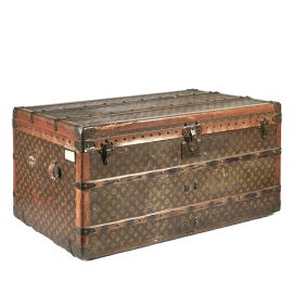 Per collezionisti e amanti del genere, baule inizio secolo che ha visibilmente viaggiato e porta con sè i segni della precedente vita. In Monogram con dettagli in ottone ormai invecchiato, come la chiusura; ossatura in legno e iniziali M.K. su un fianco.