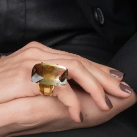BIG FUME QUARTZ RING IN 18KT YELLOW GOLD