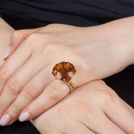 composta da un filo rigido in oro giallo 18kt, da cui pende un ciondolo in oro 9kt con quarzo citrino a forma di cuore sfaccettato e circondato da un motivo stellato con diamanti taglio huit huit, lungh. cm 28, diam. cm 11, dim. pendente cm 2,5x3, gr. 16; accompagnata da un anello in oro giallo 18kt con quarzo citrino taglio rotondo di ct 27 circa, mis. 3/43, gr. 11