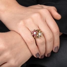 PEARL RUBY AND DIAMOND FLORAL RING IN 18KT YELLOW GOLD