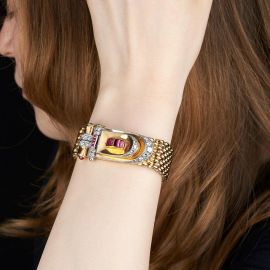 in oro giallo e bianco 18kt, realizzato a maglia tessita, impreziosito da rubini taglio baguette (uno mancante), carré e cabochon per ct 1.80 circa e diamanti taglio brillante per ct 2 circa, in corrispondenza della chiusura nasconde un orologio con quadrante firmato "Le Coultre" (difetti), indici applicati, movimento a carica manuale (non funzionante), lungh. cm 17, gr. 64