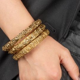 di cui uno in metallo e due in oro, gr. 52, incisi e sbalzati, raffiguranti delle ghirlande di fiori, dim. cm 7,5x7 circa, circonferenza interna cm , gr. 77 complessivi; accompagnati da una spilla in oro e argento, sormontata da un pappagallo impreziosito da turchesi taglio cabochon, dim. cm 0,5x7,5 circa, gr. 3