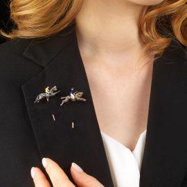 in argento e oro, decorate in smalto (difetti), sormontate da due fantini a cavallo, impreziosite da rose di diamante, dim. cm 3x6 circa, gr. 9 complessivi