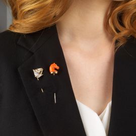 di cui una in oro giallo 18kt, dim. cm 1,5x7 circa, gr. 2; accompagnata da una seconda spilla in oro 9kt, sormontata da una testa di cavallo in corallo, dim. cm 1,5x6,5, gr. 5 complessivi