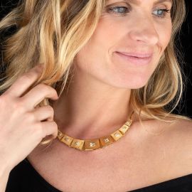 di cui una in oro giallo 18kt, realizzata a catena, punzoni 750 e del fabbricante, lungh. cm 43; accompagnata da una seconda collana in oro giallo e bianco 18kt, composta da una serie di maglie quadrangolari satinate e digradanti impreziosite da diamanti taglio brillante per ct 0.60 circa, punzoni 750 e del fabbricante, lungh. cm 44, gr. 75 complessivi