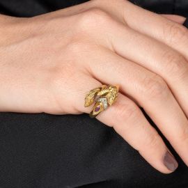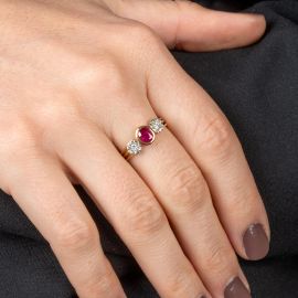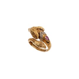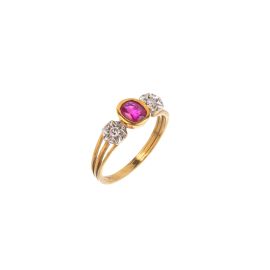 di cui uno in oro giallo e bianco 18kt, impreziosito al centro da un rubino taglio ovale di ct 0.50 circa, affiancato da due diamanti taglio brillante, punzoni 750 e del fabbricante, mis. 15/55; accompagnato da un piccolo anello a forma di ariete in oro giallo e bianco 18kt, impreziosito da rubini e diamanti, punzone 18kt, mis. 7/47, gr. 8 complessivi