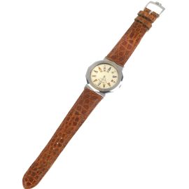 cassa in acciaio, fondello a pressione, lunetta liscia in acciaio, quadrante panna, indici con bandiere marinare, movimento a carica automatica, cinturino non originale in pelle marrone con fibbia in acciaio marcata Corum, vetro minerale. Diam. mm 34. Corredato di scatola e garanzia.