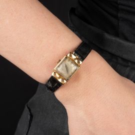 cassa di forma in oro giallo 18kt, fondello a pressione, anse fisse e ondulate, quadrante argentè (difetti), numeri arabi applicati, movimento a carica manuale, cinturino in pelle nera con fibbia in metallo non originali, vetro minerale, gr. 12. Diam. mm 17x27