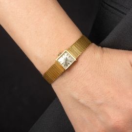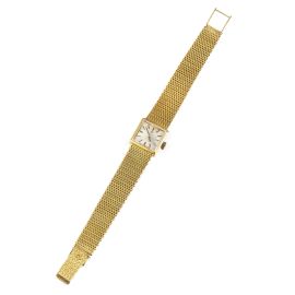 cassa di forma in oro giallo 18kt, fondello a pressione, corona marcata, quadrante argenté, indici applicati, bracciale integrato in oro giallo a maglia tessita lungh. cm 16, chiusura a scomparsa in oro giallo 18kt marcata Omega, vetro minerale, gr. 37. Dim. mm 14x14. Orologio non funzionante.