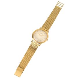cassa monoblocco in oro giallo 18kt, corona marcata, lunetta liscia, quadrante argenté (difetti), grafica nera, indici applicati, movimento a carica manuale, bracciale non originale a maglia tessita in oro giallo 18kt con chiusura a scomparsa, vetro plastica, gr. 58. Diam. mm 31