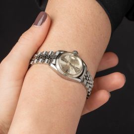 cassa in acciaio, fondello serrato a vite ref. 7582, lunetta zigrinata in oro bianco, corona marcata Rolex, quadrante argentè con indici applicati al trizio, grafica nera, datario a ore tre con lente cyclope, movimento a carica automatica cal 2555, bracciale jubilee in acciaio ref. 62523 finali 485B, lungh. interna cm 19, chiusura a scatoletta marcata Rolex, vetro plastica. Diam. mm 24.
