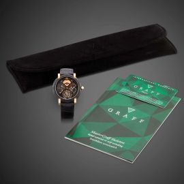 cassa faccettata in titanio di colore nero, anse sagomate in oro rosa 18kt, quadrante con movimento scheletrato, griglia nera e tourbillon, secondi a ore sei, movimento a carica manuale, cinturino in pelle nera non marcato, fibbia in oro rosa 18kt firmata Graff, vetro minerale, gr. 56. Diam. mm 43. Corredato di scatola, astuccio e garanzia.