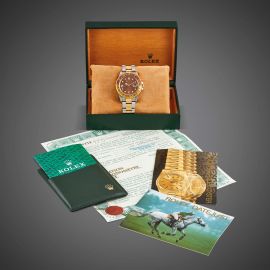 cassa in acciaio, fondello serrato a vite, corona marcata, ghiera in oro giallo con inserto bicolore, quadrante marrone con bicchierini al trizio, grafica oro, datario a ore tre con lente cyclope, movimento a carica automatica cal 3185 n. 620, bracciale oyster in acciaio e oro ref. 78363 finali 401B, lungh. interna cm 20, chiusura a scomparsa marcata Rolex, vetro minerale. Diam. mm 40. Corredato di scatola, garanzia e due maglie aggiuntive.