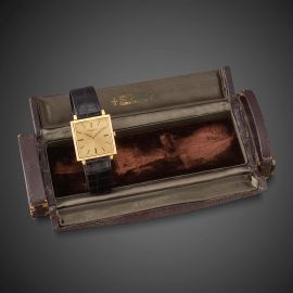 cassa di forma quadrata in oro giallo 18kt, fondello a pressione, lunetta liscia, quadrante champagne, grafica nera, indici applicati, movimento a carica manuale cal 1003 n. 568015, cinturino originale in pelle nera con fibbia in oro giallo 18kt, vetro plastica, gr. 23. Dim. mm 26x26. Corredato di scatola.