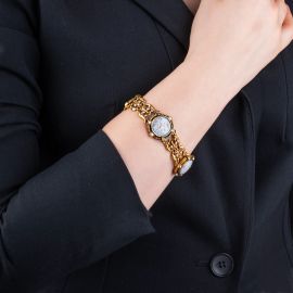 in oro giallo 18kt, composta da una serie di maglie concatenate realizzate a tralci, con formelle in smalti policromi raffiguranti piccoli angioletti, impreziosito da microperle (due mancanti), punzoni francesi del titolo e del fabbricante, lungh. cm 19, gr. 40