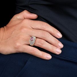 in oro giallo e bianco 18kt, impreziosito da un rubino centrale taglio ovale di ct 0.80 circa e da diamanti taglio brillante e huit huit per ct 1.50 circa, firmato "Buccelati", punzone 750, mis. 12/52, gr. 6