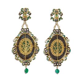 in oro e argento, realizzati seguendo un motivo a tralci decorati in smalto, con due elementi ovali smaltati su un lato, raffiguranti due scheletri affiancati da Adamo ed Eva, parti retrostanti con elementi floreali e fogliati, impreziositi da diamanti taglio brillante e smeraldi, punzone 750, chiusura a clip con perno, gr. 61 complessivi. Corredati di scatola e di certificato di autenticità del 14/06/2011.