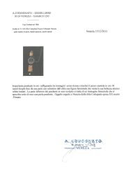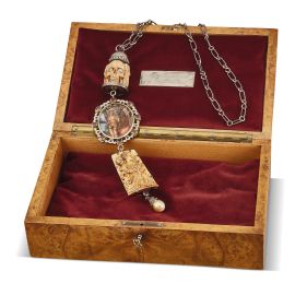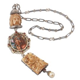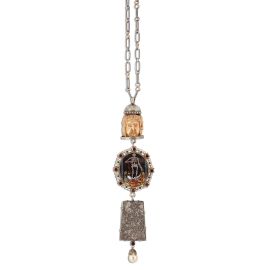 composto da catena in metallo e tre grandi pendenti in oro a basso titolo e argento di cui due realizzati in osso intagliato, volti a rappresentare figure umane alternate a scheletri e teschi, pendente centrale decorato in smalti policromi raffigurante due donne svestite e ingioiellate dietro alle quali si nasconde uno scheletro, sul lato opposto è raffigurata la morte sotto forma di scheletro con la falce, impreziosita da diamanti, granati sfaccettati e una perla pendente a goccia di mm 16x14 circa, firmato "A.Codognato", lungh. cm 110 circa, parte pendente lunga cm 25, gr. 264. Corredato di scatola e di certificato di autenticità del 15/12/2013.