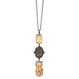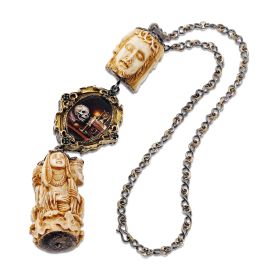 in oro a basso titolo e argento, composto da catena in metallo e tre grandi pendenti di cui due realizzati in osso intagliato, volti a rappresentare figure umane alternate a teschi, pendente centrale decorato in smalti policromi e raffigurante una scrivania al lume di candela con clessidra e teschio, sul lato opposto mostra il volto del diavolo a rilievo, firmato "A.Codognato", lungh. cm 100 circa, parte pendente lunga cm 22, gr. 258. Corredato di scatola.