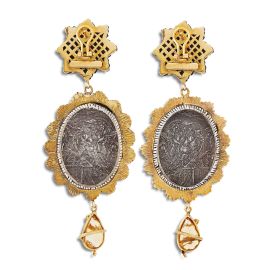 in oro e argento, con due elementi ovali smaltati su un lato, raffiguranti due teschi e con scena figurata sul retro, impreziositi da diamanti taglio brillante, da cui pendono due quarzi citrini taglio a goccia cinti da serpenti, firmati "A.Codognato", punzone 750, chiusura a clip con perno, gr. 86 complessivi. Corredati di scatola e di certificato di autenticità del 10/06/2015.