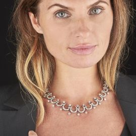 in oro bianco 18kt, composta da una serie di maglie concatenate a forma di mezzaluna intervallate a barrette, impreziosita da diamanti taglio brillante e huit huit per ct 18 circa, lungh. cm 44, gr. 88