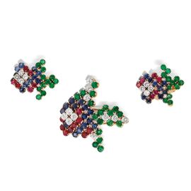 in oro giallo 18kt e platino, composta da spilla e paio di orecchini, impreziositi da rubini, zaffiri, smeraldi taglio rotondo per ct 10 circa e diamanti taglio brillante per ct 3.40 circa, firmati "Mauboussin", punzoni francesi dell'oro e del platino, marchi 750 e PT950, dim. spilla cm 4x4 circa, dim. orecchini cm 2x2,5 circa, chiusura a clip, gr. 35 complessivi