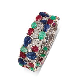 in oro bianco 18kt, realizzato a fascia, con foglie di zaffiri, rubini e smeraldi intagliati, impreziosito da diamanti taglio brillante per ct 2.50 circa, punzone 750, lungh. cm 18, gr. 73