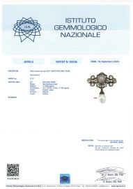 in argento, impreziosita da due perle di cui una certificata naturale di mm 10x11 circa, con diamanti taglio antico e a rosa per ct 1.80 circa, dim. cm 3,5x4 circa, gr. 9. Corredata di certificato IGN del 18/09/2024 attestante le caratteristiche della perla.