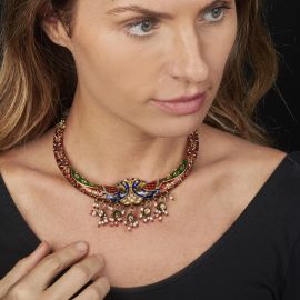 realizzata a cordicella, pettorale rigido rivestito in oro 18kt, modellato a semirchio con parte anteriore bombata e interamente decorata con smalti policromi e rose di diamante, raffigurante due pavoni da cui pendono frange in diamanti e perle, la parte posteriore piatta anch'essa interamente decorata da smalti policromi, gr. 112. Corredata di elemento pendente aggiuntivo di gr. 15