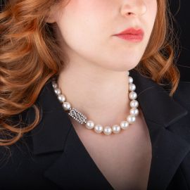 realizzata ad un filo di perle di mm 11 circa, fermatura in oro bianco 18kt impreziosita da diamanti taglio brillante e huit huit per ct 0.90 circa, lungh. cm 41, gr. 77